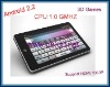Android 2.2 Android tablet ( C-OK PAD ) Specification: Hot Sell Model NumberC-OK PAD:SpecificationsCPUFreescale ARM Cortex-A8 1.0GMHZMemoryDDR512MBHard drive4Gb NAND FLASHOSAndroid 2.2 FroyoResolution800*600 (4:3)Display8" inch TFT LCD( resistive Touch Panel)LAN/3GExternal 3GWIFIWireless LAN 802.11b/gWebcamera/KeyboardUSB external keyboardMouse & Touch PadBuilt-in touch pad,support USB MouseUSB PortUSB2.0*2, High-speed USB OTGHDMISupport HDMI 1080PCart PortTF /MINI SD CardSound effectAudio build-in 0.5w*2 stereo sperkersExternal Microphone, 3.5mm EarphoneBuilt-in Monophonic RecordingBattery4000MAHEndurance timeAdvanced power management,4-6HRSPower Adaptor100-220V Input, 9V DC Output, 2AOfficeWORD, EXCEL, POWERPOINT, PDF, TXT,InsetantQQ /MSN/SKYPE/E-mailInterne BrowserInterne Browserother FunctionSupport Games . E-book, FMDigital Photo Framesupport JPG.BMP.PNG.GIF.TIFF…LanguageMulti-language supportWeight1.2KG( with battery pack)Support AudioMP3,WMA,MP2,OGG,AAC,M4A,MA4,FLAC,APE,3GP,WAV format Audio play,song listVedioAVI,RM,rmvb,MKV,WMV,MOV,MP4,PMP,MPEG,MPG, FLV3GP,MPG, Flash etc, all the video and play onlineAccessoriesOTG Line 1 PCS,adpter 1pcs,earphone 1pcs,user manual 1pcs,usb line 1pcs